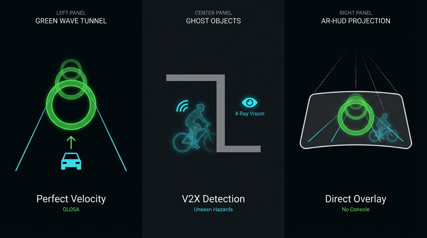 When V2X detects a cyclist hidden around a corner, the HUD renders a "Ghost" outline of the cyclist through the building, giving the driver "X-Ray vision."